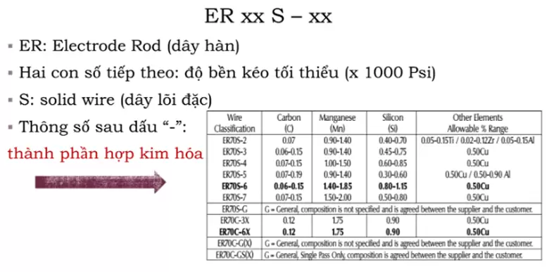 ER70S-6: "ER" là viết tắt của "Electrode or Rod" (dây hàn), "70" đại diện cho độ bền kéo tối thiểu 70.000 psi, "S" biểu thị dây hàn rắn, "6" chỉ mức độ sạch bề mặt hàn cao.