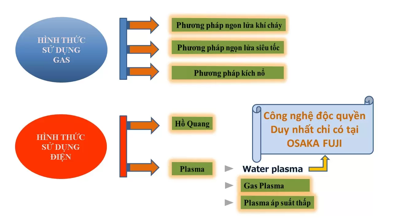 - Cơ chế hoạt động: Sử dụng ngọn lửa đốt cháy oxy và nhiên liệu để làm nguồn nhiệt.